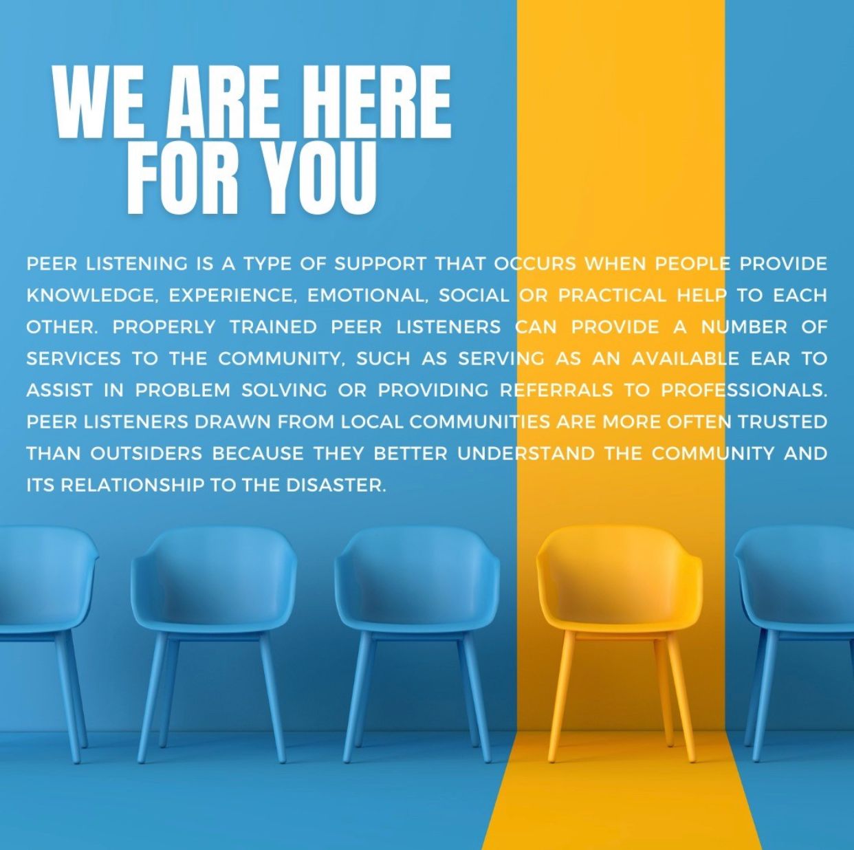 Peer listeners who have gone through proper training can provide a number of services to the community, such as serving as an available ear to assist in problem-solving or providing referrals to professionals. Peer listeners drawn from local communities are more often trusted than outsiders because they better understand the community and its relationship to the disaster.