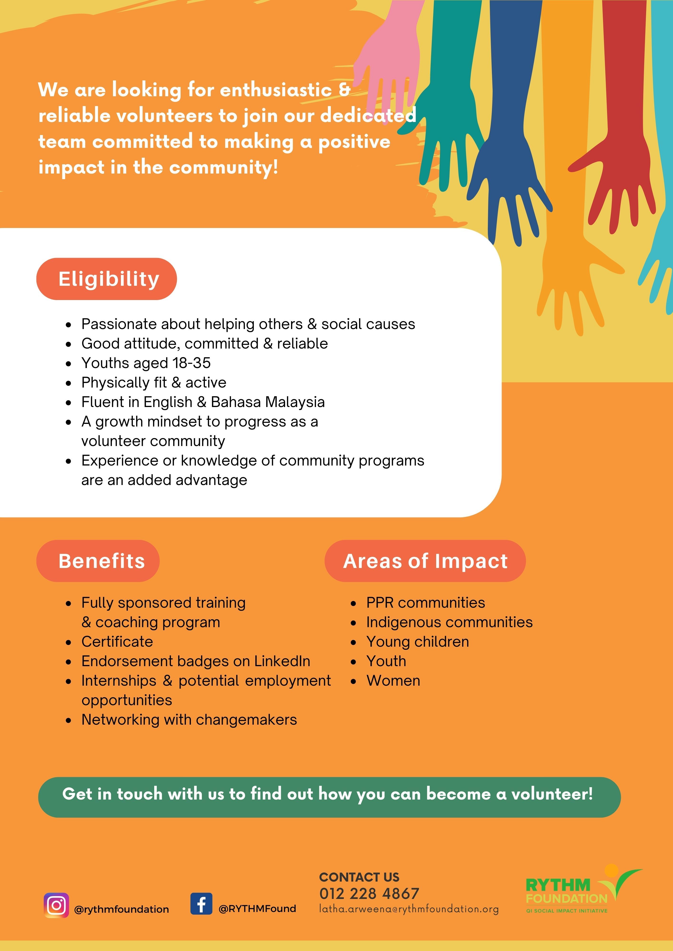 Scan me or visit platform.madforgood.org/o/RYTHM-Foundation/opportunities/Volunteer-Development-Programme-VDP/67543 to join