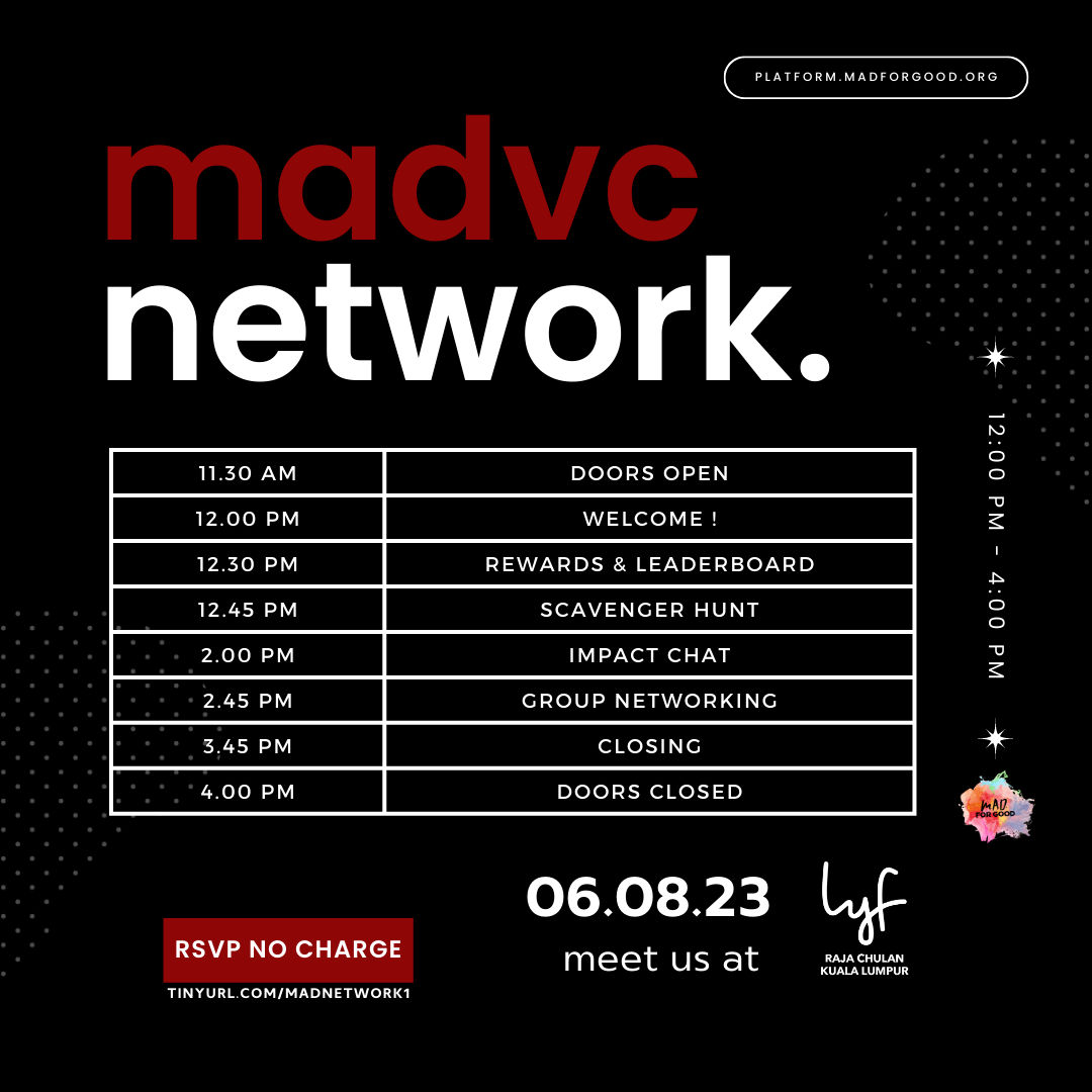 Welcome all participants of MADVC2023! Expect a day full of fun, socialising and learning from key speakers about impact-driven lives! Only for Uni students.