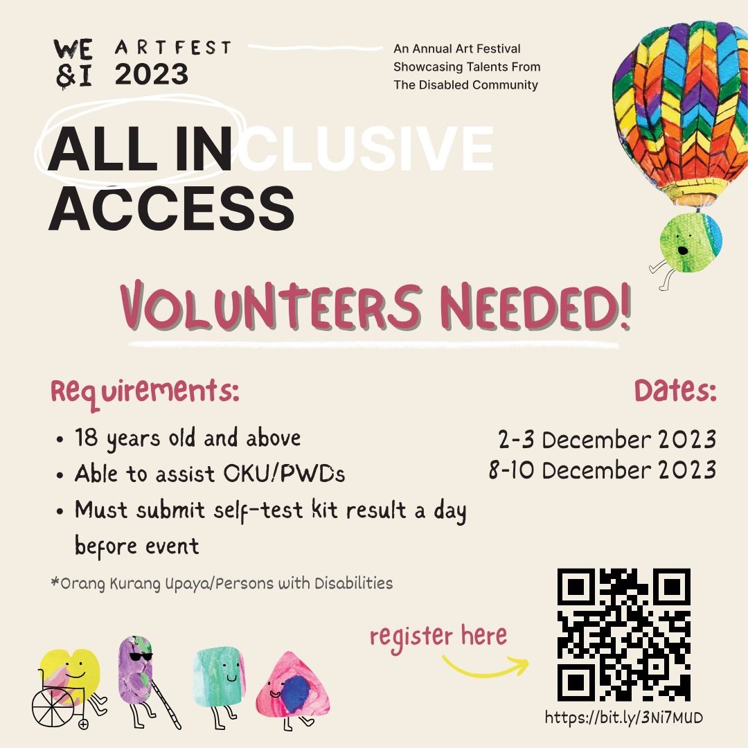 We're wondering if you'd be interested to volunteer with us for this upcoming event to assist/ accompany our PWD/ OKU friends (People with disabilities) and assist in general event management prioritising on inclusivity!;